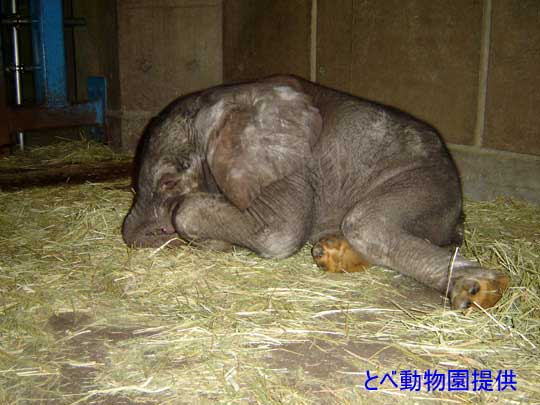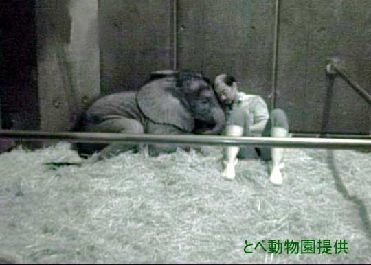 「媛、ひとりにはさせないよ。傍に居てあげるから、ゆっくりおやすみ。」 ひとりぼっちになると寂しくて眠ることもできない媛ちゃんに、飼育員さんは1年以上もゾウ舎に泊り込んで寄り添いました。 |
